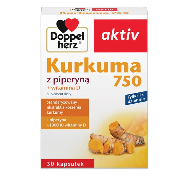 Doppelherz aktiv Kurkuma 750 - suplement diety w postaci kapsułek zawierający w swoim składzie ekstrakt z korzenia kurkumy z piperyną i witaminą D. Produkt przeznaczony dla osób dorosłych.